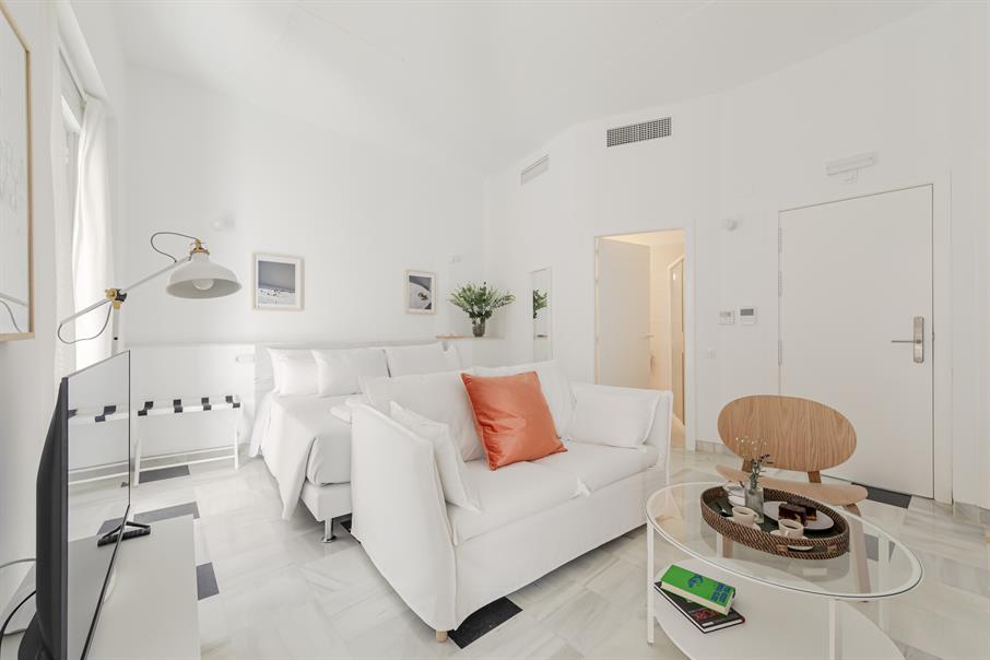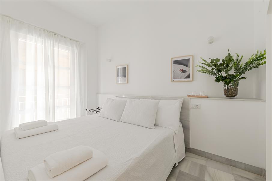 Está  situado  en la primera de la casa, con ascensor. También incluye una terraza común amueblada con tumbonas y ducha exterior de aproximadamente 20 m2 en la azotea del edificio, con vistas a la Catedral.
